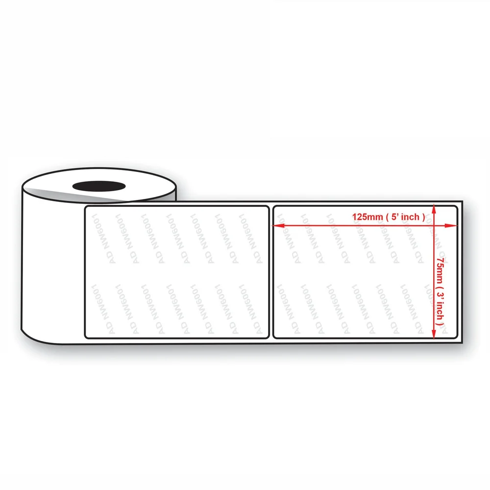 3X5 Inch Shipping Label Roll ADNW6001 Watermark used in thermal printing applications. It is 75mm wide and 125mm long and does not require any ink or ribbon for printing. Direct thermal printing technology uses heat to activate a chemical coating on the label, creating the desired image or text.