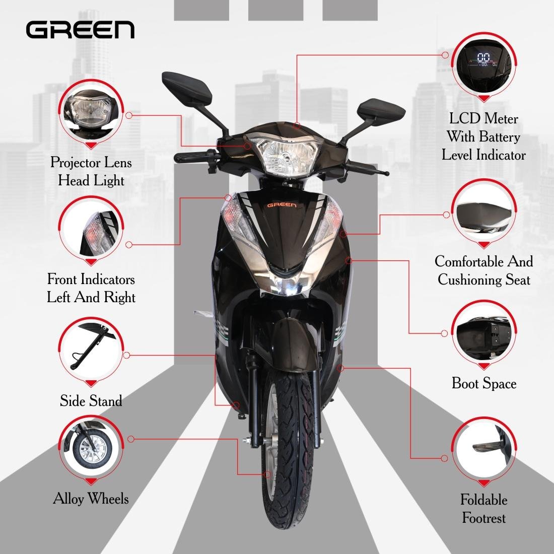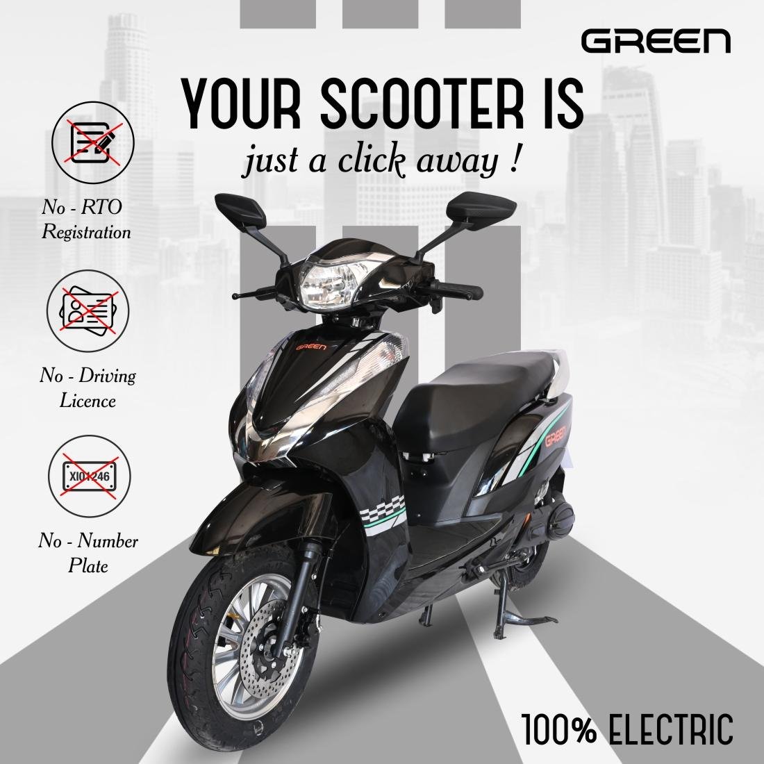 The comfortable wider deck enhances stability and provides ample room for riders, ensuring a smooth and enjoyable experience. Its modern design and user-friendly features make it suitable for riders of all skill levels. Additionally, the Green Vista requires no RTO registration or driving license, offering a hassle-free ownership experience.